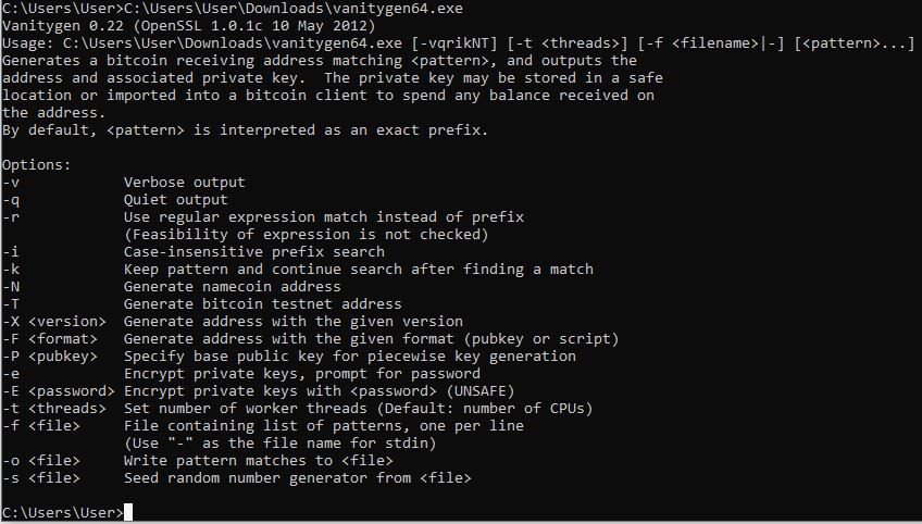 Note that the file path is set for my local machine and must be changed for a different user. You can select the path to vanitygen64.exe file by dragging the file into the cmd window (if you press enter here, it will show a list of options)